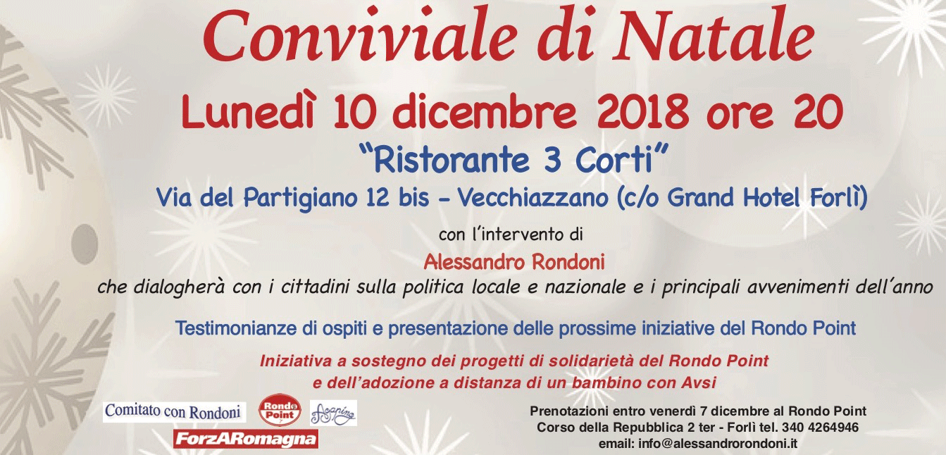Un centinaio di persone hanno partecipato al “Ristorante 3 Corti”, presso il Grand Hotel Forlì di Vecchiazzano (FC), alla tradizionale conviviale natalizia del Rondo Point con Alessandro Rondoni che è intervenuto dicendo: «Vogliamo più Forlì e più Europa. Amministrare significa rispondere alle esigenze dei cittadini guardando anche alla casa comune europea, luogo di pace e democrazia». Durante la serata, organizzata il 10 dicembre in collaborazione con il periodico “ForzARomagna”, Rondoni ha aggiunto: «È importante incontrarsi per ragionare insieme e non seguire solo gli istinti o la pancia, per conoscere, capire, riflettere e formare un giudizio libero su quanto sta accadendo. E per continuare a costruire». È quindi seguito il dialogo sulla politica locale e nazionale, anche in vista delle prossime elezioni amministrative, con Gian Luca Zattini, sindaco di Meldola e candidato sindaco a Forlì, Francesca Gardini, assessore all’urbanistica a Forlì, e Valerio Roccalbegni, sindaco di Modigliana. Sono stati inoltre ripercorsi i momenti più importanti dell’anno con video e immagini, vi sono state alcune testimonianze di ospiti e la presentazione dell’adozione a distanza da parte del Rondo Point di un bambino brasiliano con un progetto Avsi.