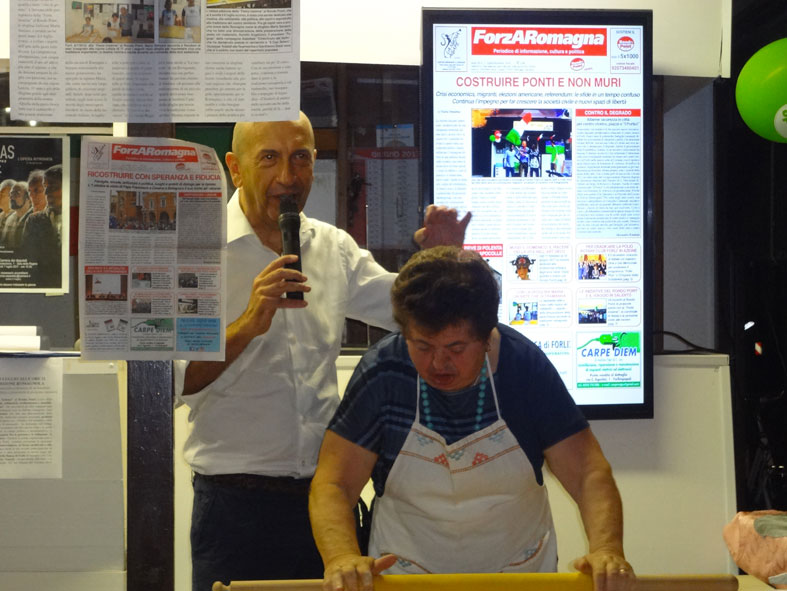 Omaggio alla tradizione romagnola con l’ampia galleria di creazioni presentata dalla pluripremiata sfoglina Maria Senzani che al Rondo Point, durante la “Festa insieme”, dialogando con Rondoni ha fatto una dimostrazione della preparazione col mattarello della pasta fresca e delle tagliatelle.