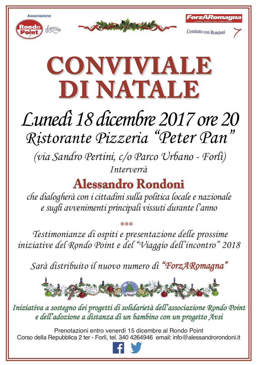 Interverrà Alessandro Rondoni che dialogherà con i cittadini sulla politica locale e nazionale e sugli avvenimenti principali vissuti durante l’anno. Ci saranno le testimonianze di alcuni ospiti e verranno presentati i progetti dell’associazione Rondo Point, fra cui l’adozione a distanza di un bambino con un progetto Avsi, le prossime iniziative e “Il viaggio dell’incontro” 2018. Durante la serata, inoltre, saranno illustrati il nuovo numero di “ForzARomagna” e le proposte editoriali e culturali del prossimo anno.