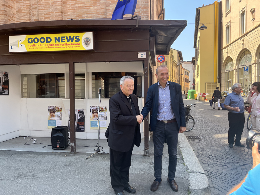 Si chiama “Good News” ed è il nuovo punto di informazione della diocesi di Forlì-Bertinoro in corso della Repubblica 2/ter, angolo piazza Saffi, inaugurato mercoledì 15 giugno alla presenza del vescovo, mons. Livio Corazza, e di autorità civili, militari ed ecclesiali. Si tratta, come ha sottolineato il vescovo, del «nuovo punto di informazione delle iniziative della diocesi, di ascolto delle persone e dei loro bisogni, per le finalità dell’Ufficio comunicazioni sociali, coinvolgendo gli altri Uffici pastorali e il settimanale diocesano “Il Momento”». Cambia così volto il “Rondo Point”, storica edicola forlivese, per tanti anni originale punto di incontro, ascolto e informazione fondato nel 2009 dal giornalista Alessandro Rondoni, direttore dell’Ufficio Comunicazioni sociali della Ceer, che recentemente lo ha donato alla città. «Ho fatto un regalo a Forlì e alla diocesi - ha affermato Rondoni nel suo intervento alla cerimonia - perché si possano ascoltare le persone, far conoscere e promuovere le iniziative culturali, editoriali e di carità, specie quelle rivolte ai giovani e alle persone bisognose». E ricordando i 13 anni durante i quali ha incontrato migliaia di cittadini per dialogare, ascoltare segnalazioni e richieste, ha sottolineato: «Sono stato in mezzo alla gente, in questo crocevia nell’angolo della piazza, per ascoltare e costruire comunicando, nel segno dell’accoglienza e dell’integrazione». Alla cerimonia sono intervenuti anche il direttore de “Il Momento”, don Franco Appi, gli assessori Rosaria Tassinari a Paola Casara in rappresentanza dell’Amministrazione comunale, il responsabile della Caritas diocesana, Filippo Monari, e quello dell’Ufficio per le comunicazioni sociali, don Giovanni Amati. «Siamo Chiesa in uscita - ha affermato don Appi - verso la piazza, l’agorà. Abbiamo bisogno di stare qui per ascoltare, come invita a fare Papa Francesco che nel messaggio per la Giornata mondiale delle Comunicazioni sociali chiede di farlo con l’orecchio del cuore». La Tassinari ha ricordato che «questa iniziativa aiuta a valorizzare il centro storico e a dare voce a chi ci vive. L’Amministrazione si rende disponibile a collaborare». Monari ha poi evidenziato che «è bello mettersi al servizio e comunicare le esperienze della Chiesa», ricordando che sarà la segreteria Caritas a fare da referente per le prenotazioni dello spazio, per realtà e gruppi, e dove vi saranno momenti dedicati in modo speciale ai giovani. Erano presenti pure il vicario episcopale per la carità, don Stefano Pascucci, altri sacerdoti e rappresentanti degli uffici pastorali della diocesi fra i quali Sauro Bandi, Walter Neri, Roberto Ravaioli, Claudio Leonessi. “Good News” sarà quindi un nuovo luogo di ascolto e come ha sottolineato il vescovo «è stato donato alla diocesi in questo anno in cui ricorderemo grandi testimoni e comunicatori: l’ottavo centenario della presenza e della prima predica proprio qui a Forlì di Sant’Antonio, il 70° anniversario della morte di mons. Giuseppe Prati, il familiare don Pippo dei forlivesi, e l’80° dell’arrivo a Forlì dei Salesiani». La cerimonia si è conclusa con il taglio del nastro e la benedizione del vescovo, prima della quale mons. Corazza ha ricordato che «alla fine di questo primo anno di cammino sinodale, dove abbiamo incontrato più di cinquecento gruppi, sentiamo ancora di più la necessità di uscire, di incontrare e ascoltare le persone e abbiamo ora la possibilità di questo punto di visibilità nella piazza centrale di Forlì, un luogo aperto alla città e per l’attenzione alle persone bisognose», e ha ringraziato Rondoni che, anche come direttore per le Comunicazioni sociali della Conferenza Episcopale Emilia-Romagna, ha accompagnato questo passaggio. La mission di “Good News”, come è stato spiegato dai promotori, è quella di «raccontare “buone notizie”, contrastando le fake news e il clima di scetticismo e negatività, ascoltare le persone, promuovere e animare testimonianze di evangelizzazione». “Good News” è a disposizione di tutti gli uffici diocesani, gruppi, associazioni e movimenti che lo desiderano, per realizzare attività ed eventi durante l’anno in maniera sia continuativa sia saltuaria. Il referente è l’Ufficio Comunicazioni sociali, diretto da don Amati, e la segreteria della Caritas diocesana, che si sta attivando per tenere aperto lo spazio ogni venerdì mattina, sarà punto di riferimento per il calendario degli appuntamenti, delle prenotazioni e i vari aspetti organizzativi. Info: segreteria Caritas diocesana 0543 30299 dal lunedì al venerdì 9-12, 15-17 oppure via mail a Questo indirizzo email è protetto dagli spambots. È necessario abilitare JavaScript per vederlo..